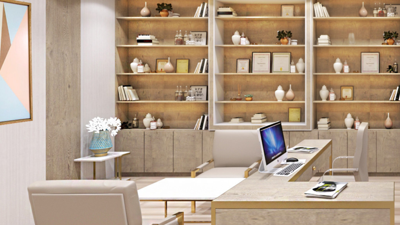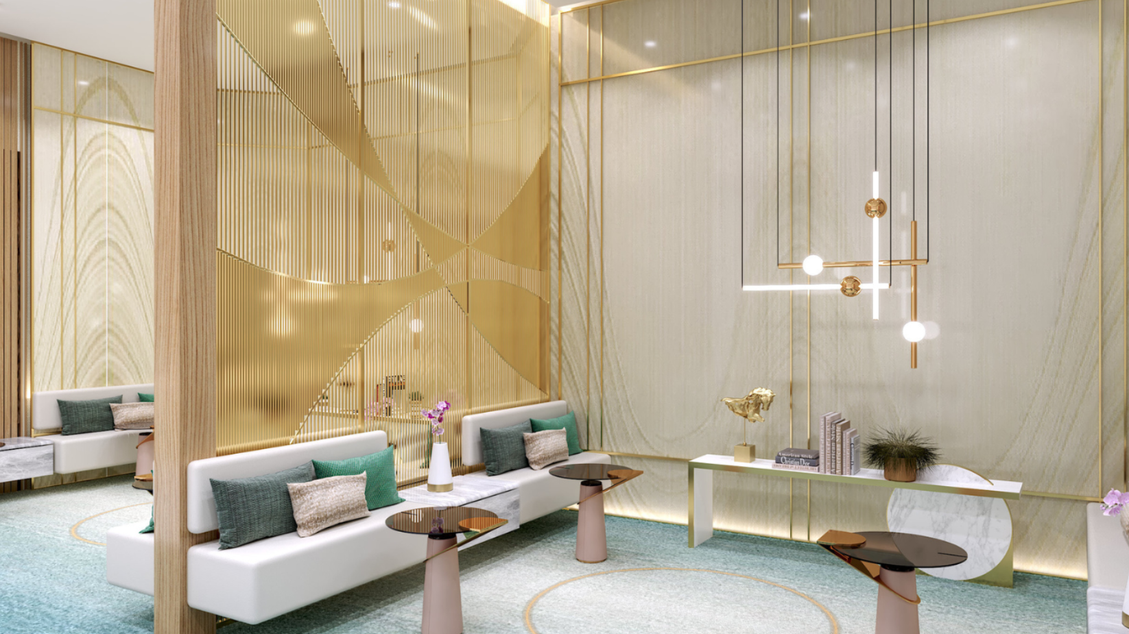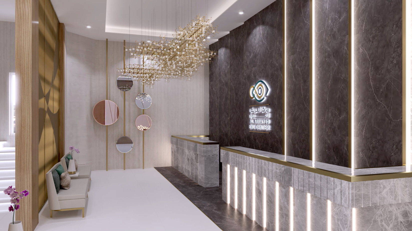 Our studies of various eye instruments and the functions of the eye inspired the design throughout. Upon entry, guests are greeted with tranquillity and visual beauty, communicated via soft neutral tones and a lighting installation called Traces (Lasvit by Katrina & Katrina). This installation features a large scattering of lenses representing the expression of human emotion through rays of light and colour. The former clinical feel is replaced with that of an inviting hotel retreat. The inclusion of marble, wood, and gold finishes provides a luxurious feel, supporting the brand’s maturity and establishment.