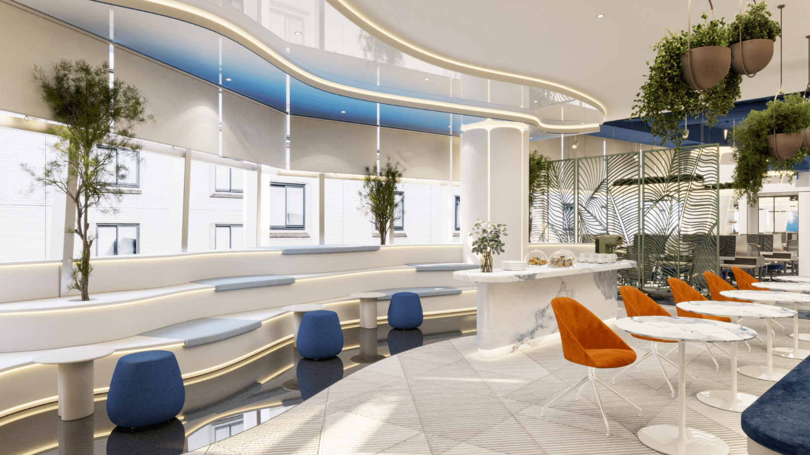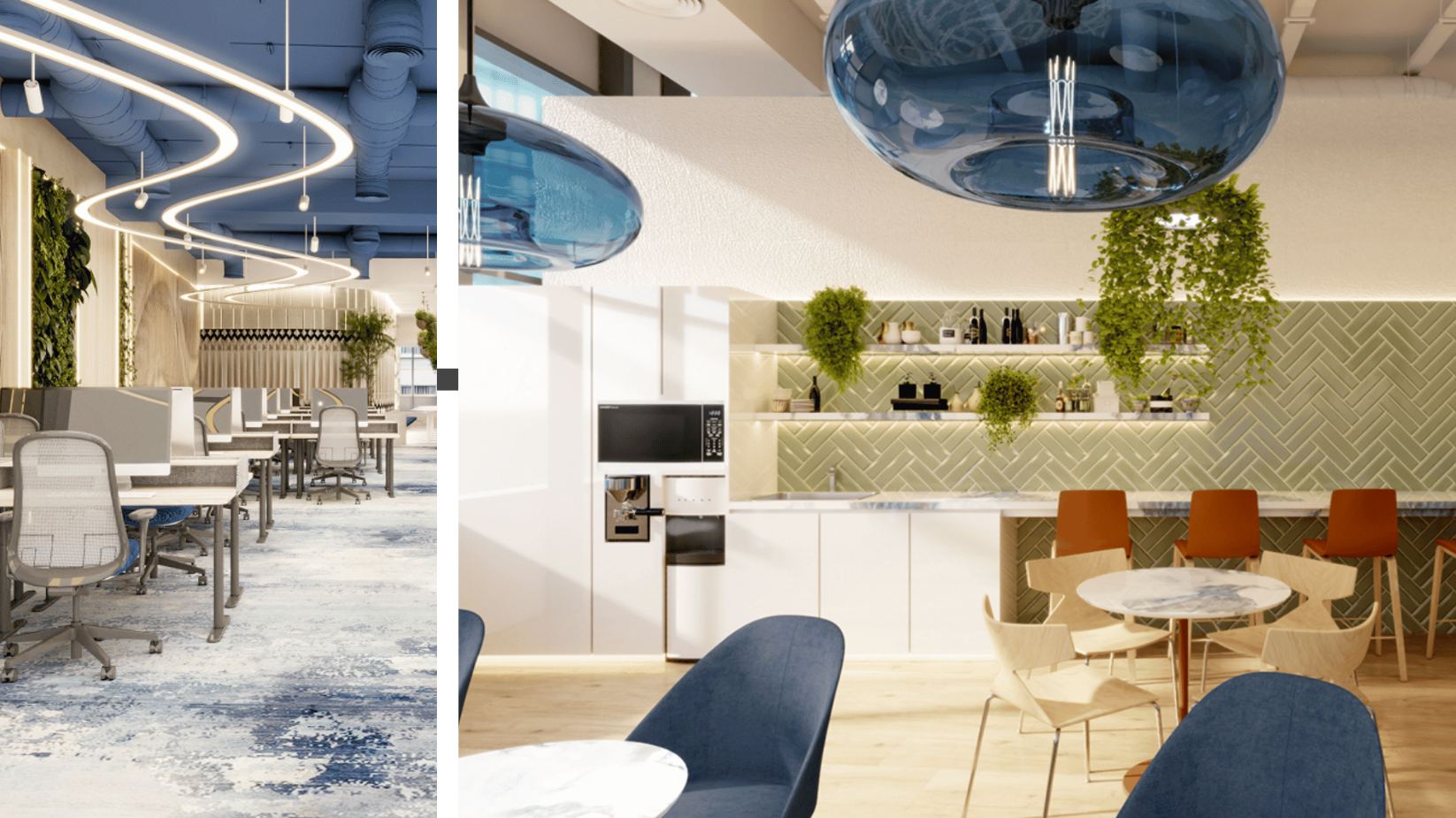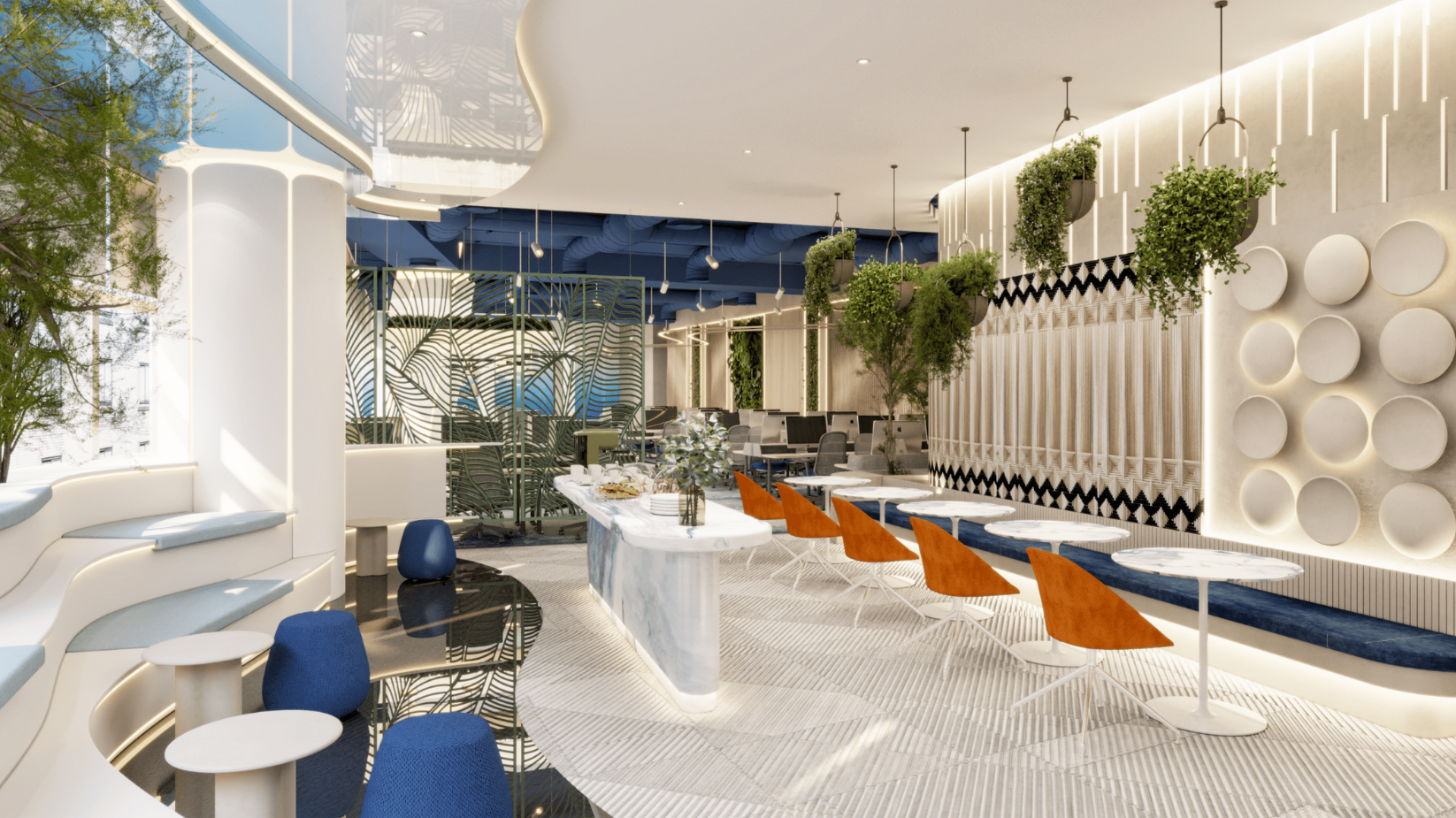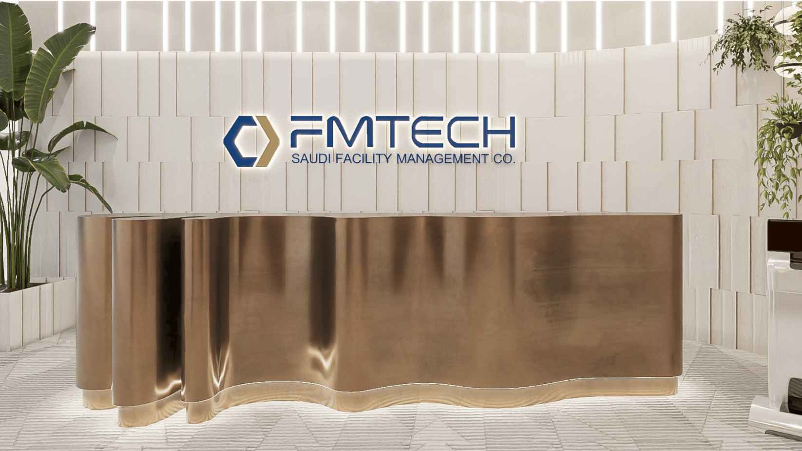 Brand Creative crafted FM TECH’s Riyadh headquarters with rich biophilic design elements, incorporating wood textures and subtle hints of blue throughout the space. The unique lighting system blends white LED fixtures with the glimmering opulence of copper, illuminating the ergonomic design of the office. This bright and open environment not only enhances comfort but also reflects FM TECH’s mission of fostering innovation and their vision for a modern, collaborative workspace that supports the growth of the Middle East’s facilities management industry.