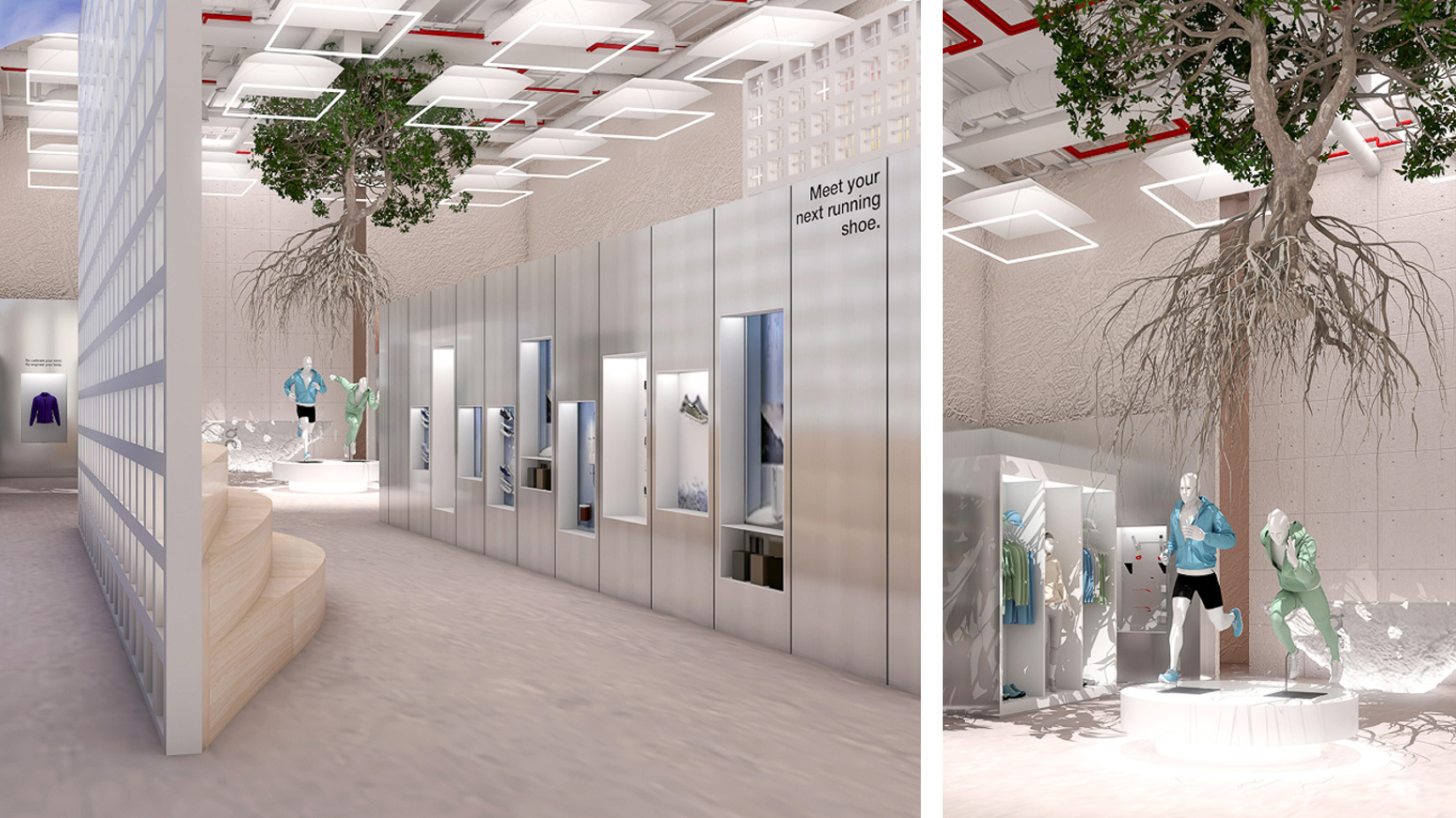 On Running's MENA flagship concept is an immersive experience that begins the moment guests walk through the angled biosand portal. The store features sensory “loom” areas, the Engadin rock enclosed in glass and sand as an homage to the brand’s Swiss roots, and a walking ghaf tree suspended mid-air to symbolise its connection to the Middle East. Two curved displays mimic the shifting sands of the desert, while the perimeter walls are clad in 3D-extruded datecrete panels forming sand-like waves.