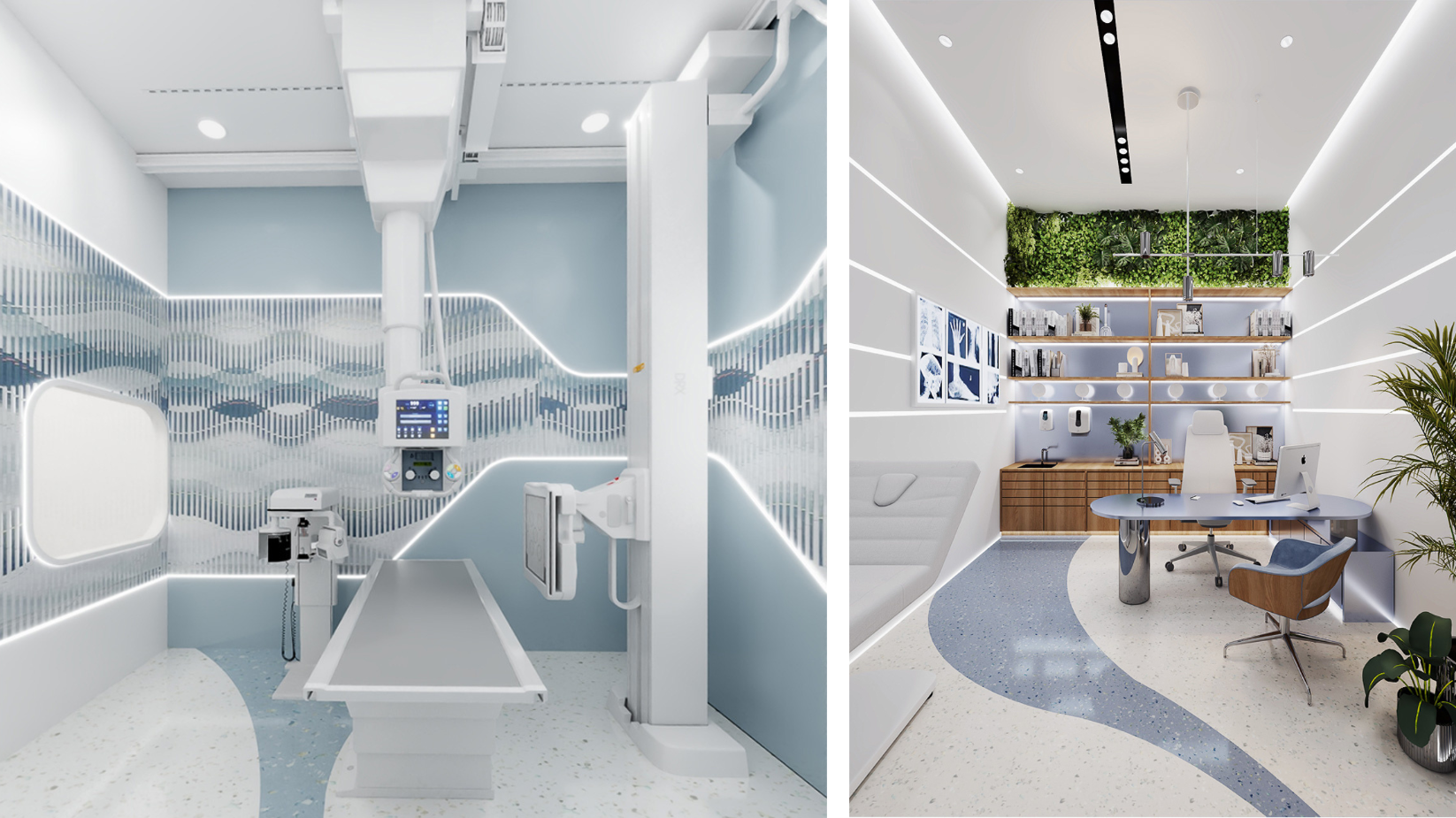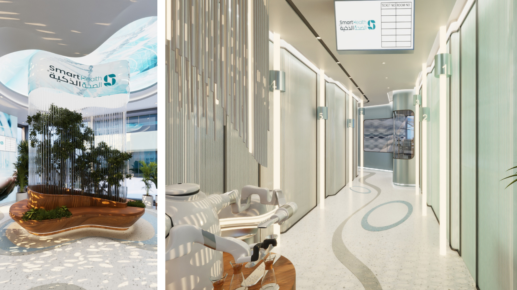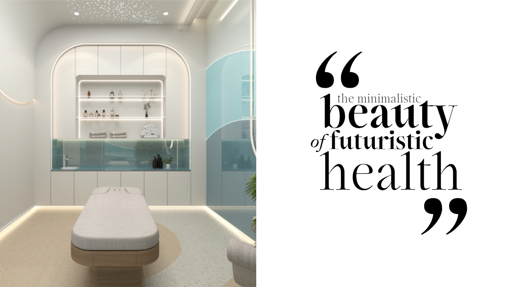 With a unique concept merging the technological marvel and minimalistic beauty of futuristic health, we incorporated organic biophilic elements alongside clean, curvilinear glass panels, wall displays, and flooring. Bright lighting, a natural colour palette, and smart technology create a harmonious, ergonomic design suited for health professionals and VIP guests alike. A welcoming reception was designed to mimic the forest of the future – with glass rods, wood, and a robotic beverage station. Display screens and a beautifully partitioned ladies’ area complete the look.